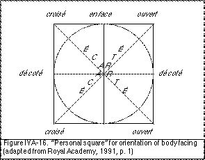 The directional orientation of body facings in ballet, known as the directions of épaulement or the eight directions of the body (Grant, 1982), is conceived according to a square with dimensional orientations directed toward the edge midpoints, and diagonal orientations directed toward the corners (Fig. IVA-16). These directions are commonly presented in ballet manuals as diagonal and dimensional lines through the centre of a square (Bazarova and Mey, 1987, p. 49; Grant, 1982, p. 125; Hammond, 1974, p. 65).