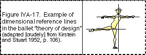 The prototypicality of dimensions in the ballet conception is also evident in visual illustrations where dimensional lines are superimposed over drawings of the human body to illustrate part of the space module and the theory of design for basic ballet positions in the classic text by Kirstein and Stuart (1952, pp. 2, 20, 30, 81,104, 106) (Fig. IVA-17). These dimensional line reference grids are a similar type of abstracted conceptual representation as the cubic and octahedral networks used by Laban (see IVA.20).