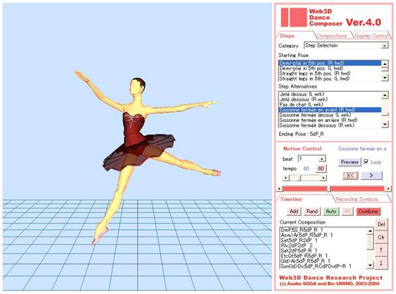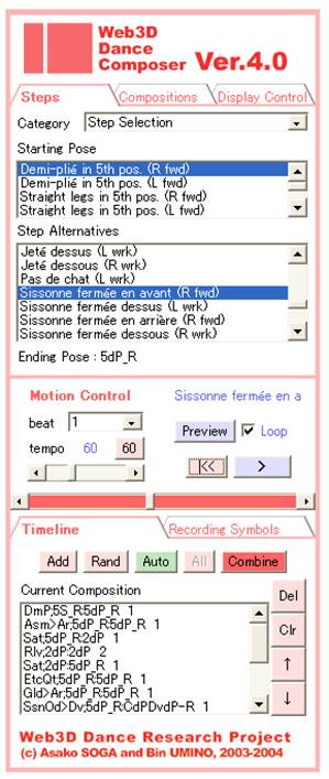 The “step catalogue panel” allows browsing and selecting motions from the step archive in pull-down menus, once selected they can be previewed in the VRML viewer and inserted into an extended sequence. These are saved as plain text code for data processing. The “motion control panel” offers buttons for play, pause, and rewind, as well as a menu for changing the beat of each step, and a scroll bar for adjusting tempo. Additionally buttons for ‘Preview’ and ‘Loop’ allow a step to be previewed or observed repeatedly.