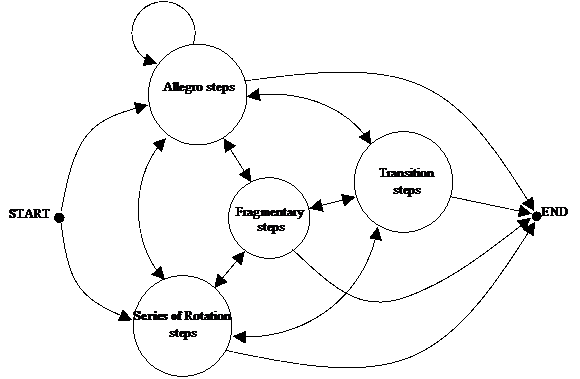 The algorithm for automatic composition was constructed under this strategy. Since the upper-body movement was basically an accompaniment to the particular step in ballet lessons, the algorithm took account of only the lower-body movements. The first constraint for the algorithm is step continuity. This constraint regarding transitions between steps (Factor 2) orders steps according to the anatomical requirement whereby the ending pose of the previous step becomes the beginning pose of the next step. At the start point of designing the algorithm, the 5th position of the feet was chosen as the starting position for all the enchaînements, as this practice is the most commonly used in petit allegro lessons. At the end of any enchaînement the algorithm selects 1 out of the 3 possible poses which were identified by the ballet teachers as appropriate final positions.
