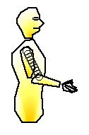 Morasso (1986) also measured the trajectory of the shoulder when the trajectory of the hand takes it beyond arms length requiring shoulder displacement (scapula sliding across the back) and thus shifting the bodys centre of gravity sideways and/or upwards (pp. 23-24) or actually requiring the Subject to locomote (p. 34). In these cases the shoulder and hand begin moving simultaneously and move towards the same locus or along parallel directions. In either case it can be said that the trajectory of the shoulder mimics the trajectory of the hand (p. 34). Both the shoulder and the hand exhibited the same pattern of path segments and curvature peaks. The shoulder path was a reduced and translated version of the hand path (see IIID.25).