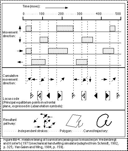 Vredenbregt and Koster (1971) represent the relative timing of the four motors in a graphic figure (Fig. IIIB-4). The action of each motor is represented as the length of a hatched area (Also in Schmidt, 1982, p. 325; Van Galen and Wing, 1984, p. 159). By changing the relative timing of the motors the shapes of the written letters could be modified in a way analogous to individual styles of writing. Here the relative timing changed the length of various strokes and so the writing appeared different, but the order and directions of the strokes remained identical so the letter could still be recognised. This type of analysis is used in this research as a basis of a taxonomy for distinguishing between categories of kinespheric paths (see Appendix XVI).