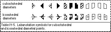 Examples of notations for cuboctahedral diametral points and diametral lines are given in Table IV-4. Peripheral lines in the cuboctahedral net are parallel to the central directional lines and so are included as examples of the same diametral direction.