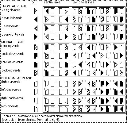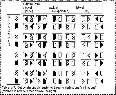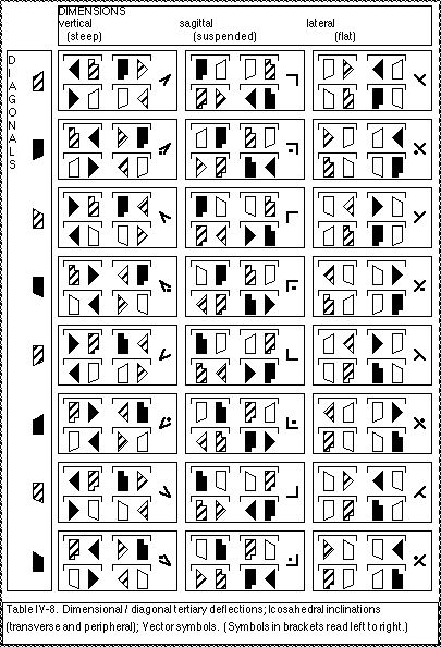 A total of 30 transverse lines can be constructed by linking pairs of loci within an icosahedral network. These can be grouped into 15 pairs of parallel lines, each pair being oriented along the same direction. These 15 directions can then be grouped into 3 transverse dimensions and 12 transverse inclinations. This yields 12 possible inclinations within the icosahedral network. Each inclination can be produced in two directions, thus yielding a total of 24 possible tertiary deflected directions. Examples of the tertiary deflections are notated in Table IV-8. Peripheral lines in the icosahedral net are parallel to the transverse inclinations and so are also considered to be tertiary deflections. Vector symbols can also be used to notate tertiary deflections without regards to specific locations.