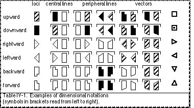 Each dimension has two directions and these are referred to as the dimensional directions (Laban, 1966, pp. 11, 14). Various terminology can be used for the dimensional directions (eg. deep, low, down, and downward can all refer to the same direction). They will be referred to here as upward, downward, rightward, leftward, forward, and backward. Dimensional directions can be notated in various ways. Table IV-1 lists some possibilities for notating limb paths and poses as dimensional points with a single direction symbol, as dimensional lines of motion with pairs of direction symbols, and as the line of limb motion (regardless of particular positions) with vector symbols.