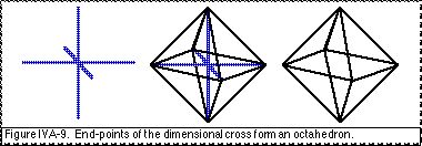 When the three dimensions are arranged to intersect at the centre of the kinesphere Laban (1966) refers to them collectively as the dimensional cross (pp. 1316). This is identical with the Cartesian cross when it is aligned with the bodys anatomy. When the end-points of the dimensional cross are connected, they form an octahedral-shaped kinespheric network (p. 103) (Fig. IVA-9).