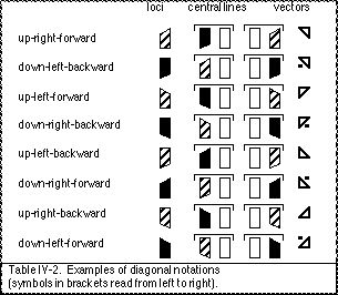 Each of the four choreutic pure diagonals can be produced in either of two directions. These eight diagonal directions do not have individual names and so are referred to in terms of their dimensional content. Table IV-2 gives examples of diagonal directions notated as directional points, directional lines and vectors.