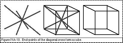 When the four pure diagonals are arranged to intersect at the centre of the kinesphere Laban (1966) refers to them collectively as the diagonal cross (pp. 14, 16). When the end-points of the diagonal cross are joined together they form a cubicshaped kinespheric network (p. 104) (Fig. IVA-10).