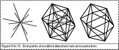 There are six diameters (two diameters within each Cartesian plane). When these are arranged to intersect at the centre of the kinesphere they can be referred to collectively as the diametral cross (Laban, 1966, pp. 1516). When the end-points of the primary deflected diametral cross are joined together they form a cuboctahedral-shaped kinespheric network (Laban, 1966 p. 104) (Fig. IVA.13). This cuboctahedron net can be conceptually simplified by regarding it as derived from a cube (Fig. IVA.14) and so primary deflections might be referred to as cubic diameters, or as cuboctahedral diameters. When the ends of the modified diametral cross are joined together they form an icosahedral-shaped kinespheric network (Fig. IVA.15). These can be referred to as icosahedral diameters.